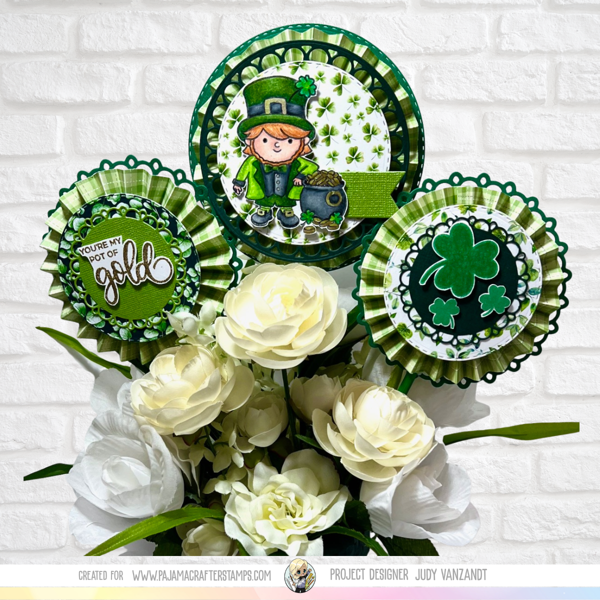 Looking for a great way to turn your paper crafting supplies into a dimensional decoration that would be perfect for a gift, party décor, or a cheerful seasonal display? Judy V here and today I’m sharing a fun and festive St. Patrick’s Day rosette bouquet featuring several products from Pajama Crafter Stamps! Pajama Crafter Products Used You’re My…